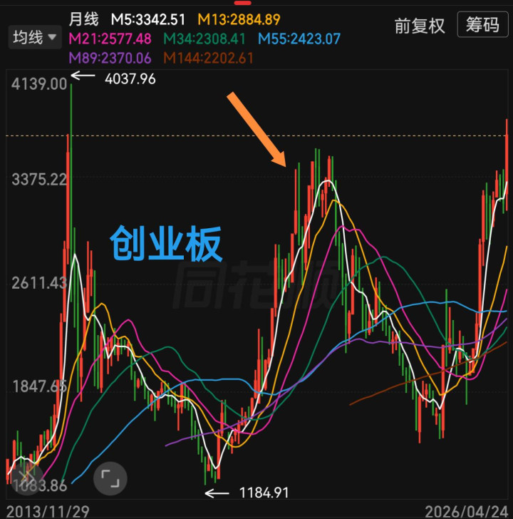 最大的风险在创业板,横盘半年以后,四月大涨,这个走势跟2021年初比较像。同时注意,创业板突破2021年高点,卡在2015年最高点压力下。